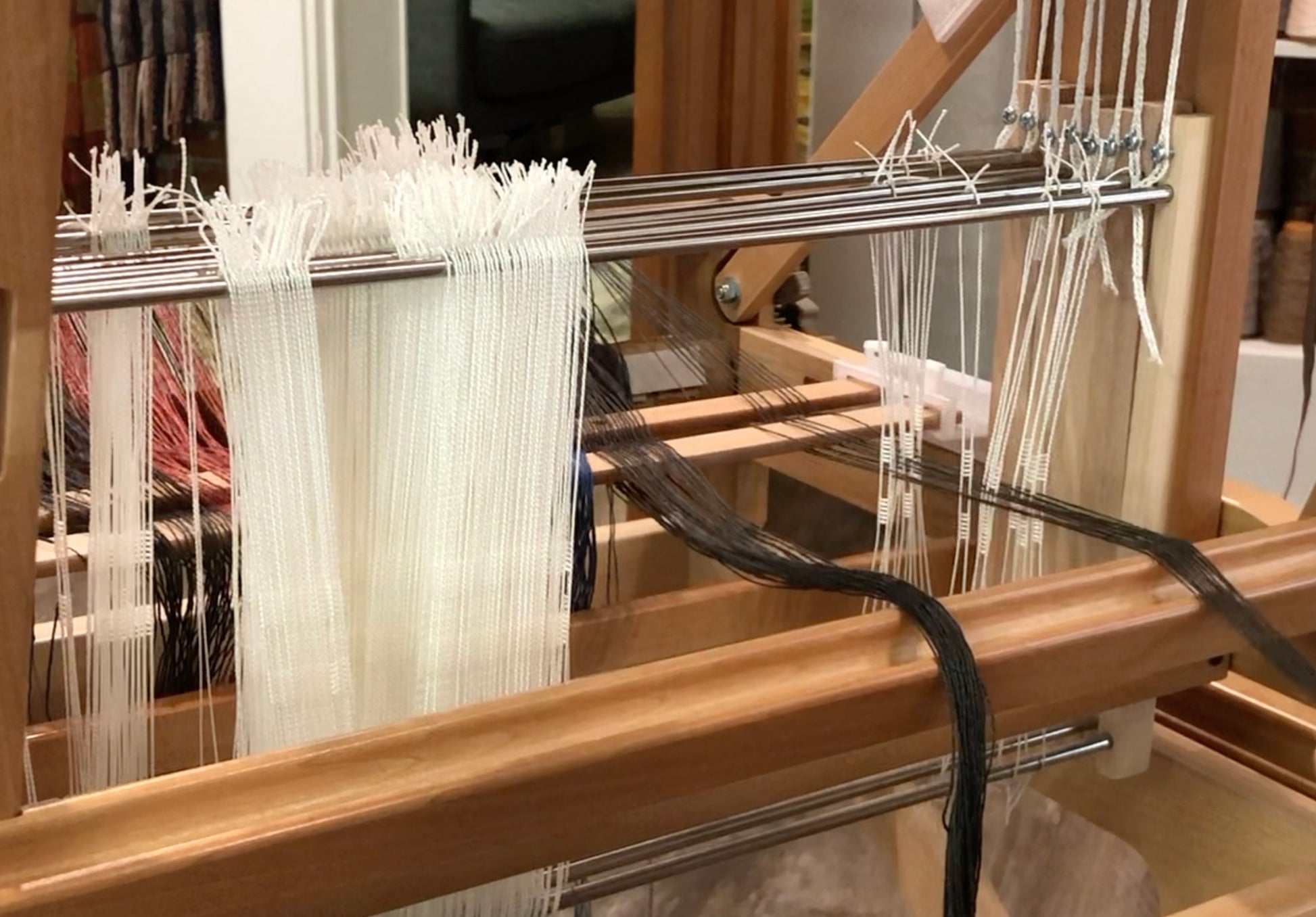 This handy tool holds your lease sticks at a convenient position for sleying the reed and beaming. Once the warp is wound on, the helping hands is moved to a position holding the lease sticks near the heddle eyes for threading.