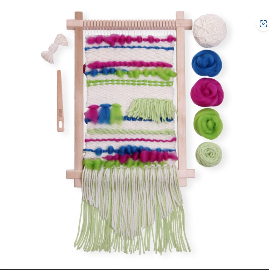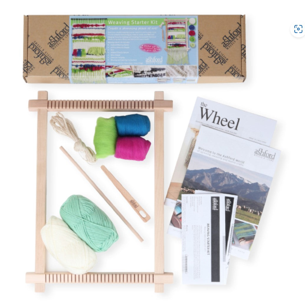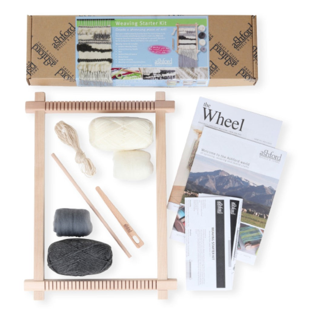 Weaving Starter kit includes: Ashford Weaving Frame, Ashford Weaving Needle, yarn, Ashford fibre for texture, warp thread, dowel for hanging and instructions.