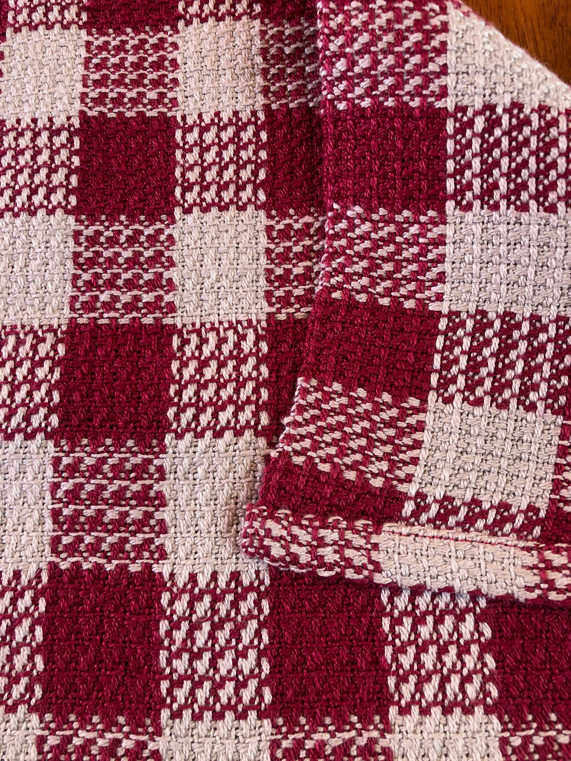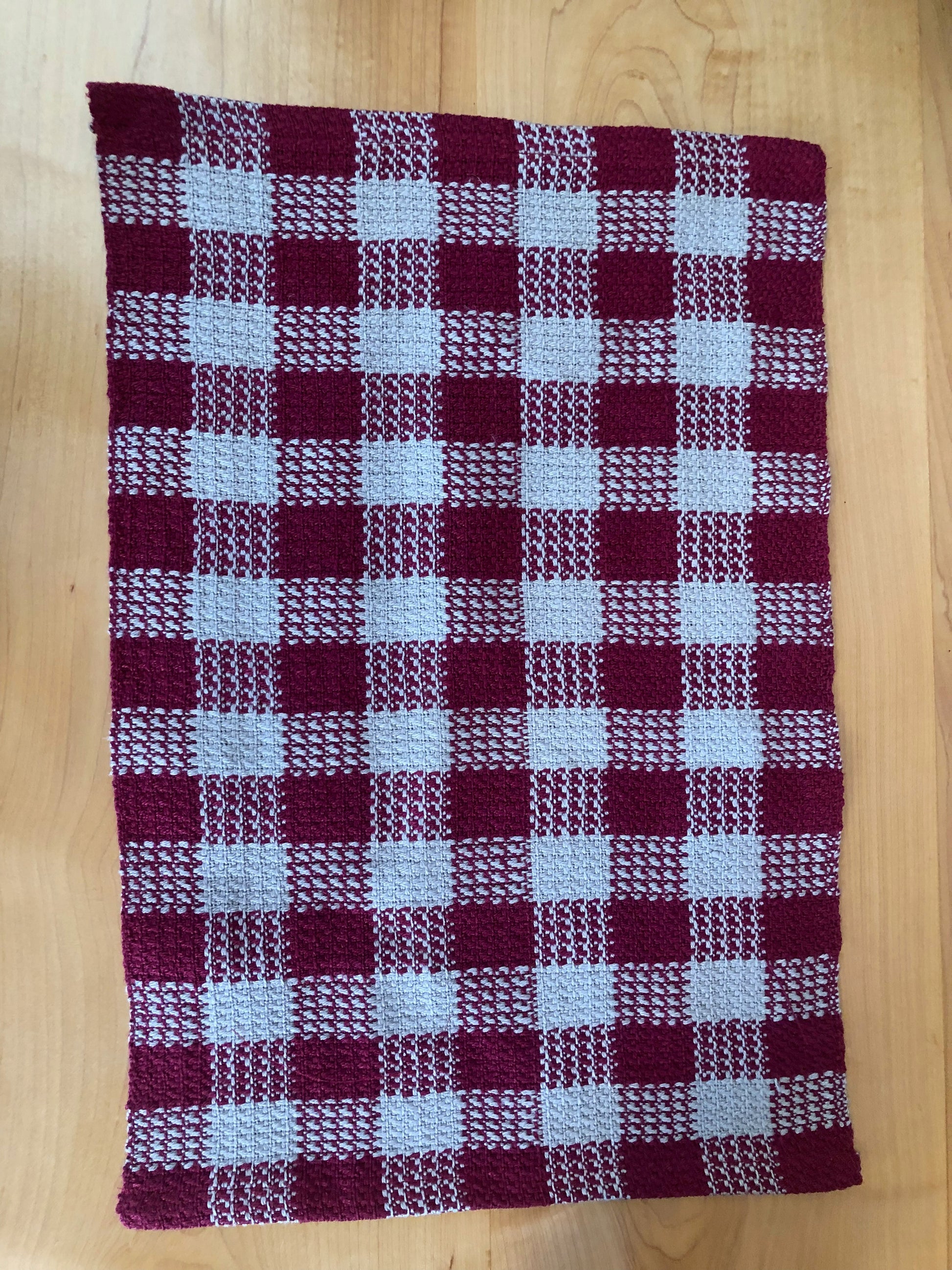 Buffalo Check has big bold checks, often with one check black but more recently in many colors. This easy 4-shaft pattern produces a thick placemat due to the 14/2 linen and the undulating twill weave structure. Shown in Burgundy and Cloud Grey, but weave choosing two 8-ounce cones of your favorite colors for your fun set of placemats. A 4-yard warp with two 8-ounce cones will allow for 4 12.5 x 18.5" placemats.