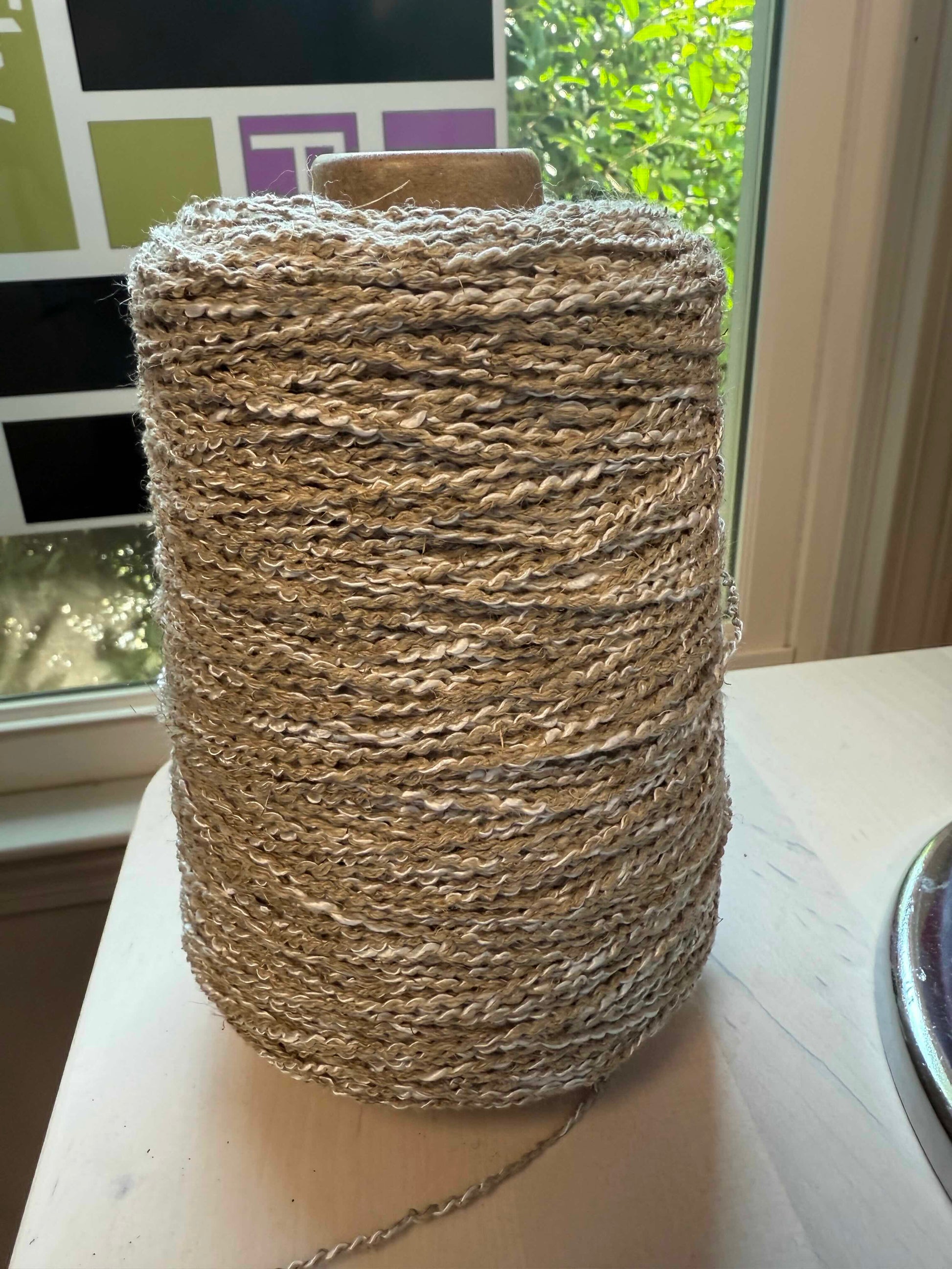 SMALL boucle - This natural colored boucle linen is 85% linen with 15% nylon for the binder. This 10.7 LEA linen has 3210 yards per pound. Cones are 4 ounces (802 yards) or 8 ounces (1604 yards).
