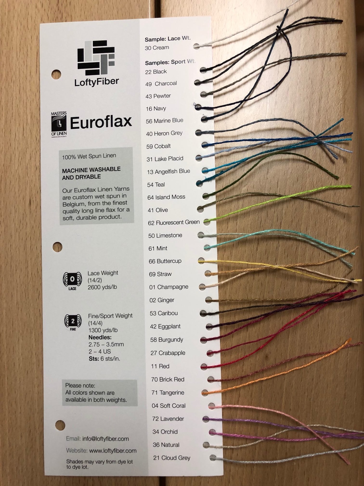 Color cards with 32 color samples in Euroflax Linen in the 14/4 (Sport Weight) yarn and one 14/2 in color Cream. Newer colors including Aqua, French Blue, Steel Grey and Wasabi are provided on handwound bobbins along with the color card.