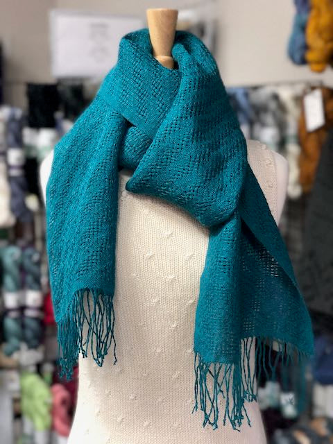 The pictured scarf is woven in color Teal. You could also use a different color for warp and weft for a slightly different look. This pattern works well as a table runner.