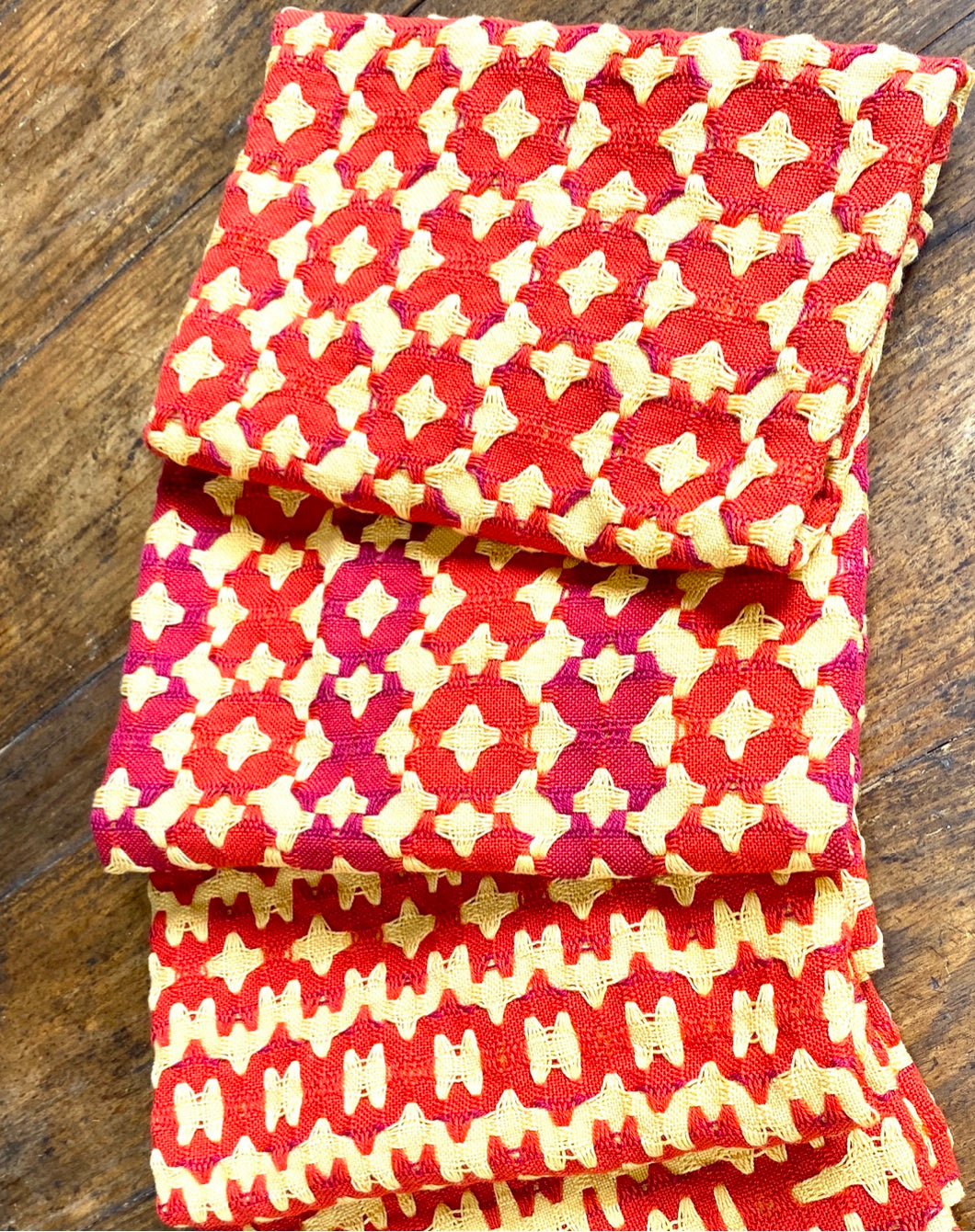 This fun deflected doubleweave pattern by Elisabeth Hill is a fun and modern pattern! This is for towels, but you may want to use this for scarves and baby blankets as well! This is a revised version using 8/2 Cotton or 8/2 Cottolin. There are 5 variations included in this pattern, but many more are possible. Put on a long warp — you will have lots of fun, and get lots of “kissy face” from friends and family who receive these towels as gifts. Optional inkle hanging band instructions are included.