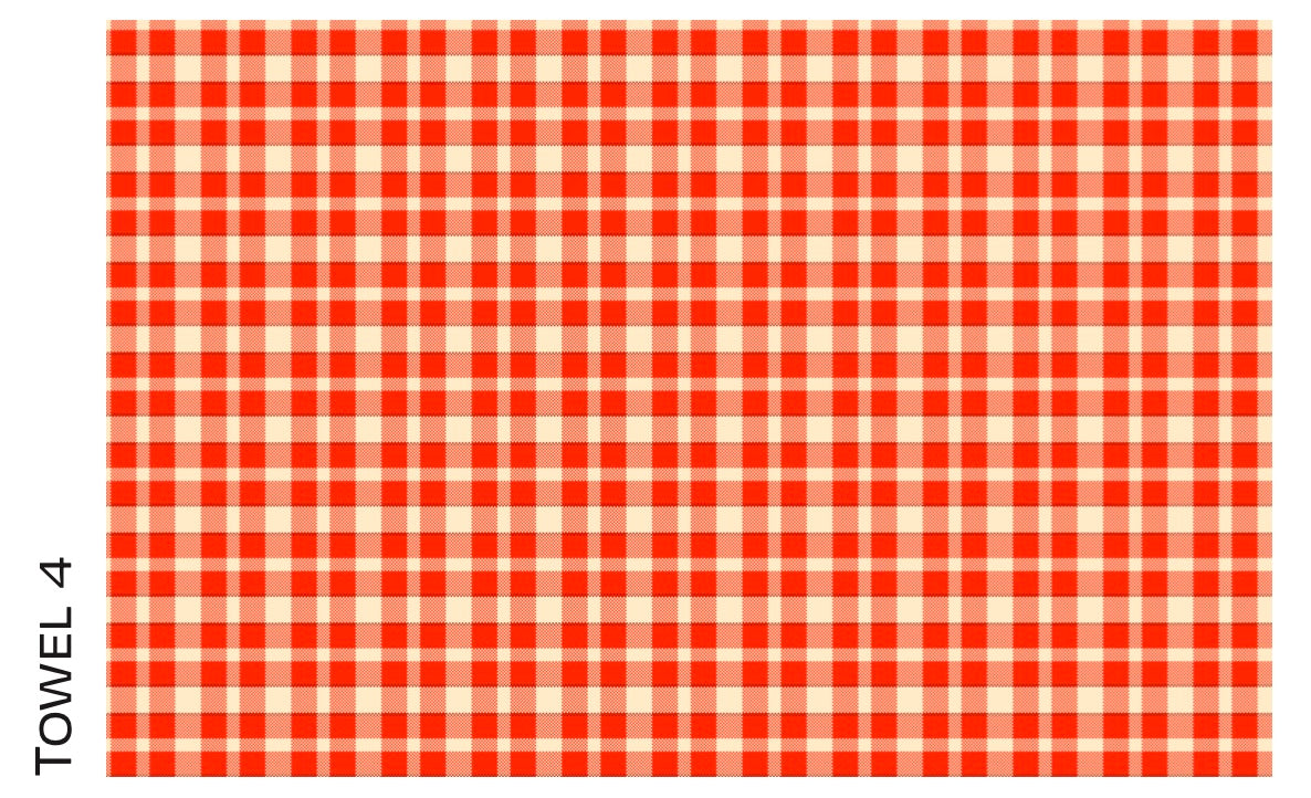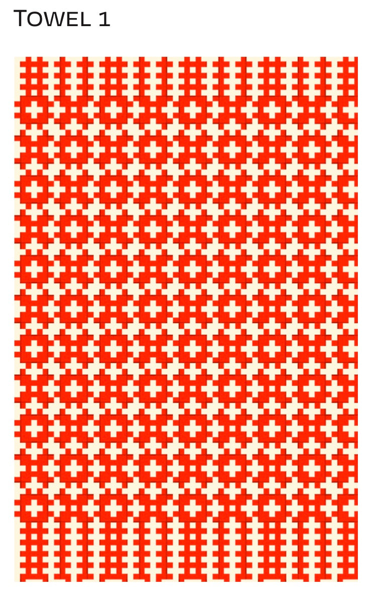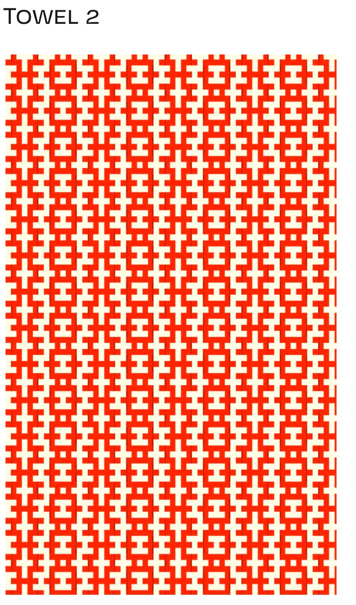 Colors and yardage requirements as shown for a 5-yard warp (4 towels plus additional sample. For each additional towel, add 1 yard)