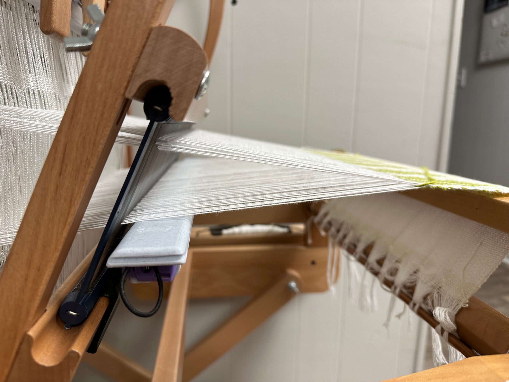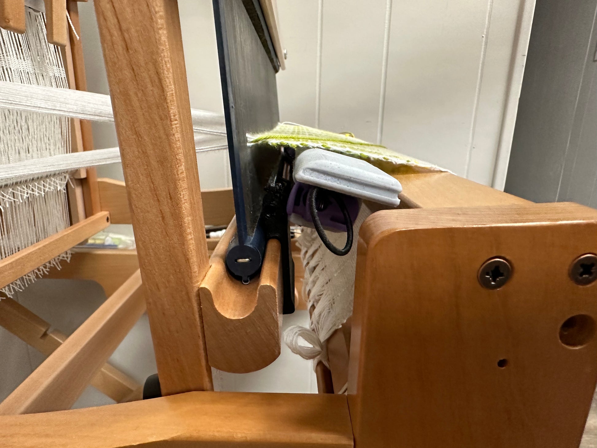 This new LOFTFIBER shuttle race for the Ashford Table loom is now available for preorder. The race is available for the 16, 24 and 32-inch width looms. It's very quick and easy to put on and take off. You should be able to weave with the fell line as close as 2 1/4in from the edge of the front beam. The race tilts as needed to accommodate greater weaving room.