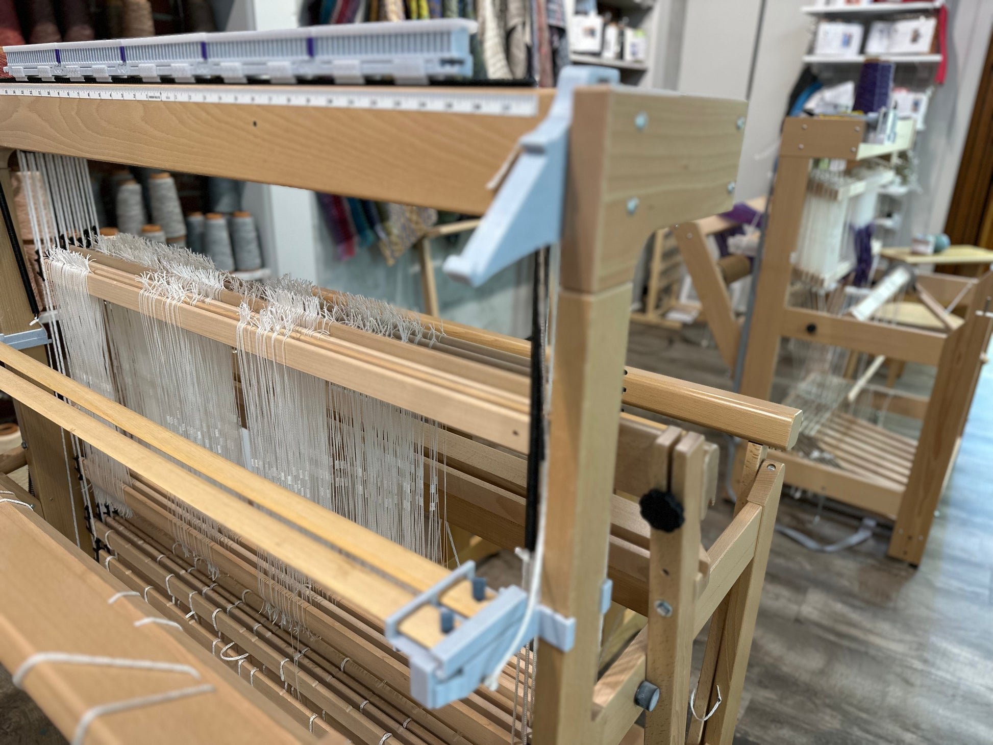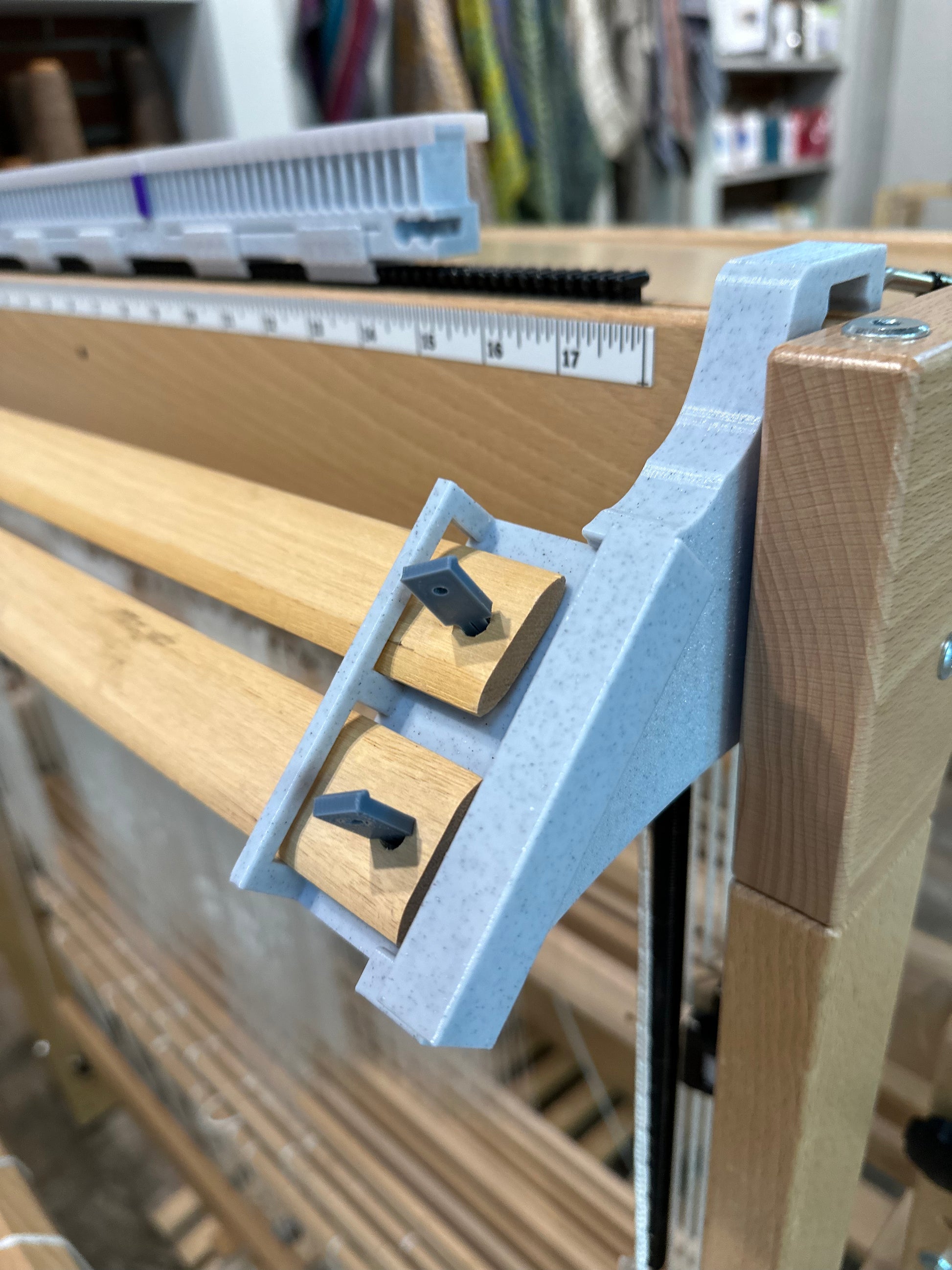 This handy tool holds your lease sticks at a convenient position for sleying the reed and beaming. Once the warp is wound on, the helping hands is moved to a position holding the lease sticks near the heddle eyes for threading. Please click here for a video demo of warping the Spring 2: Link for Warping Video