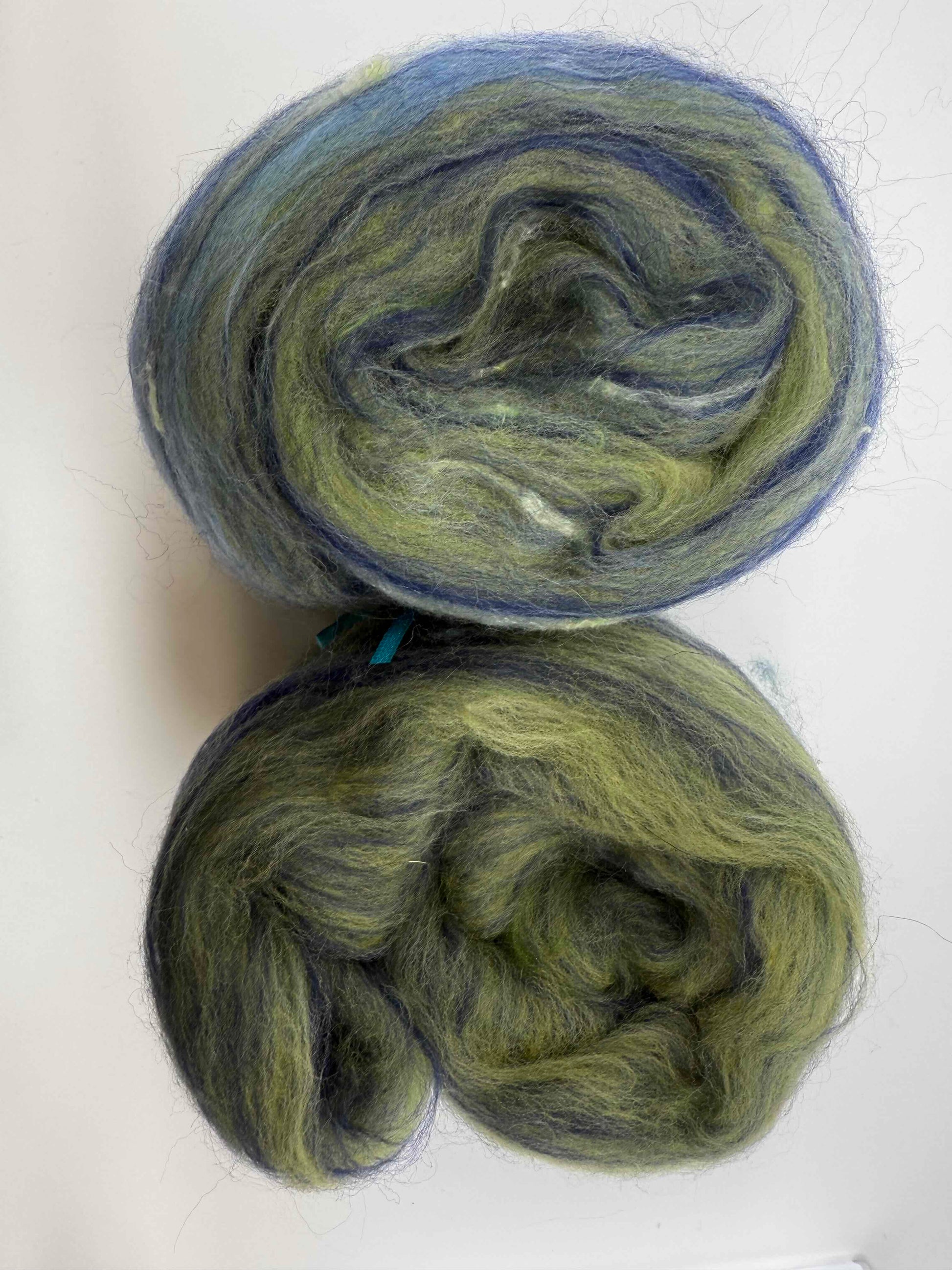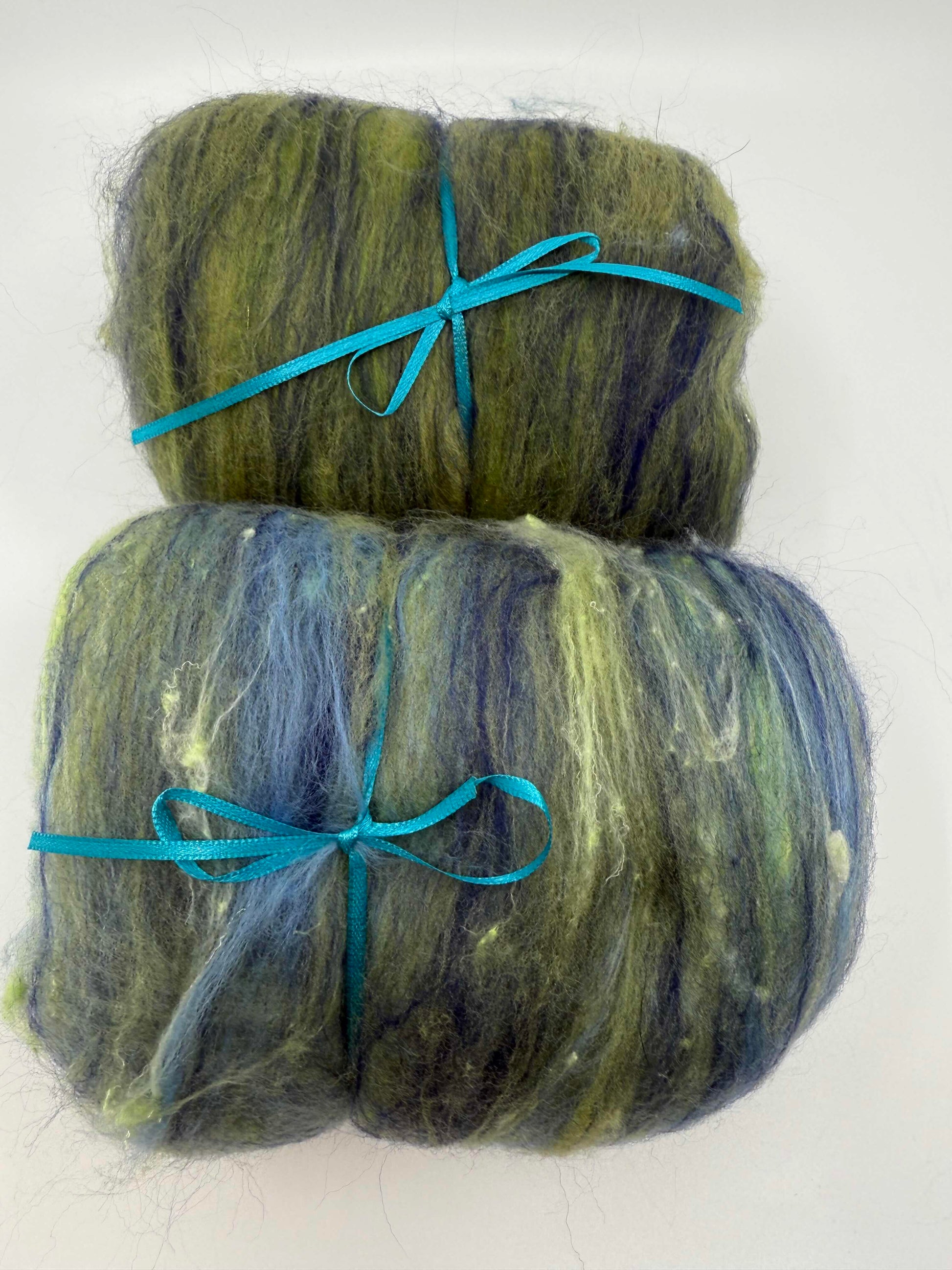 1.6 ounces of fine wool, silk, textured silk on one batt, and 1.6 ounces of fine wool, silk and angelina on the second batt.