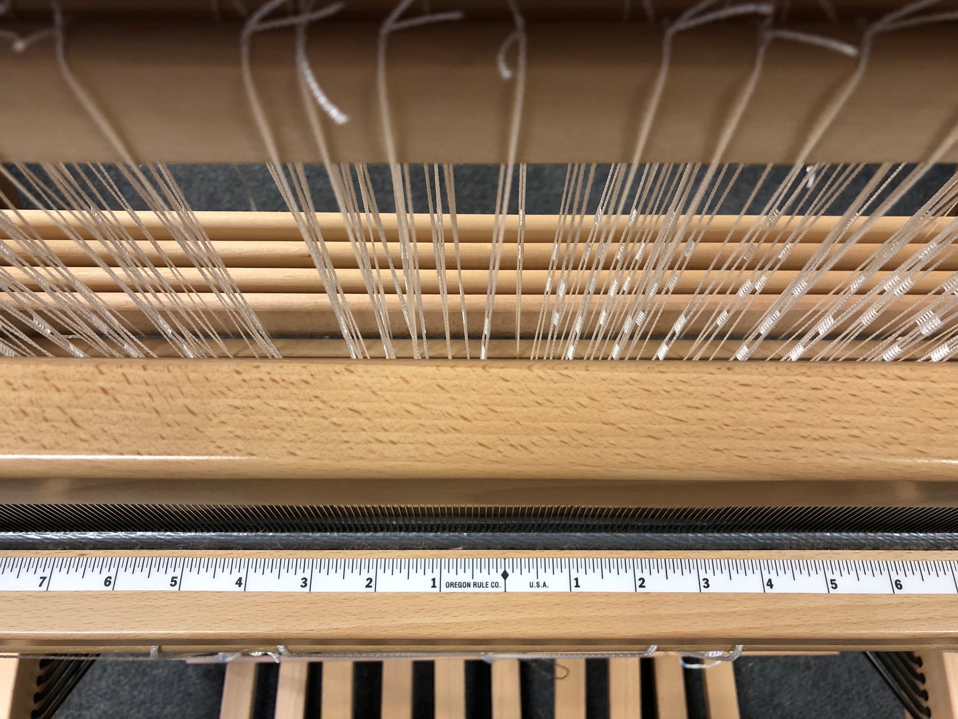 These tapes are zero centered and make centering your warp in the reed a snap. The tapes have a peel off backing. The center of the tape is placed at the middle of your beater or shuttle race. The measuring tape counts up from the center point.