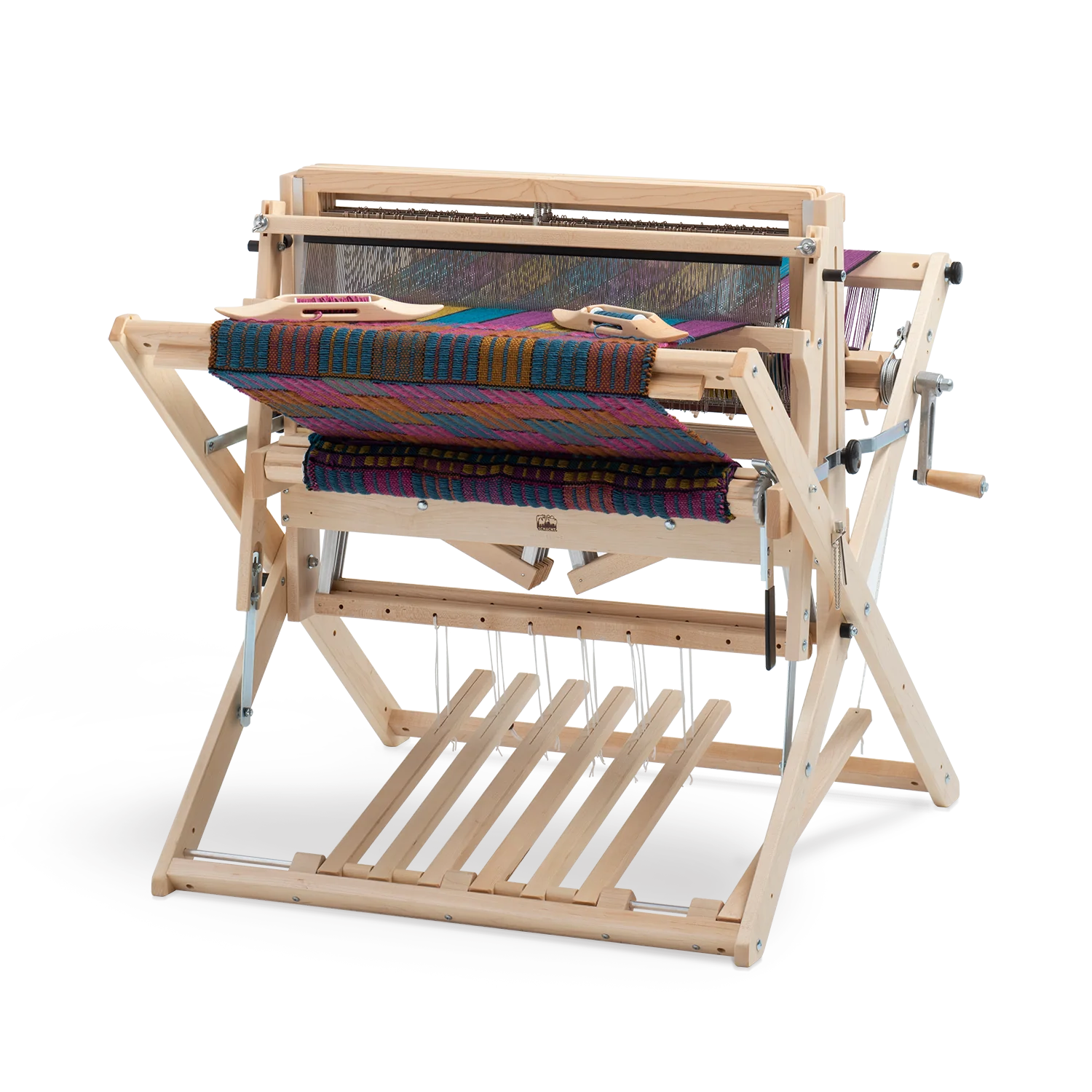 The weaving width of the Baby Wolf is 26″. You have your choice of four or eight shafts, or you can choose our Four Now-Four Later* model which allows you to expand from four shafts to eight shafts at any time. The X-frame design is exceptionally stable and can be easily folded to a depth of 18″.