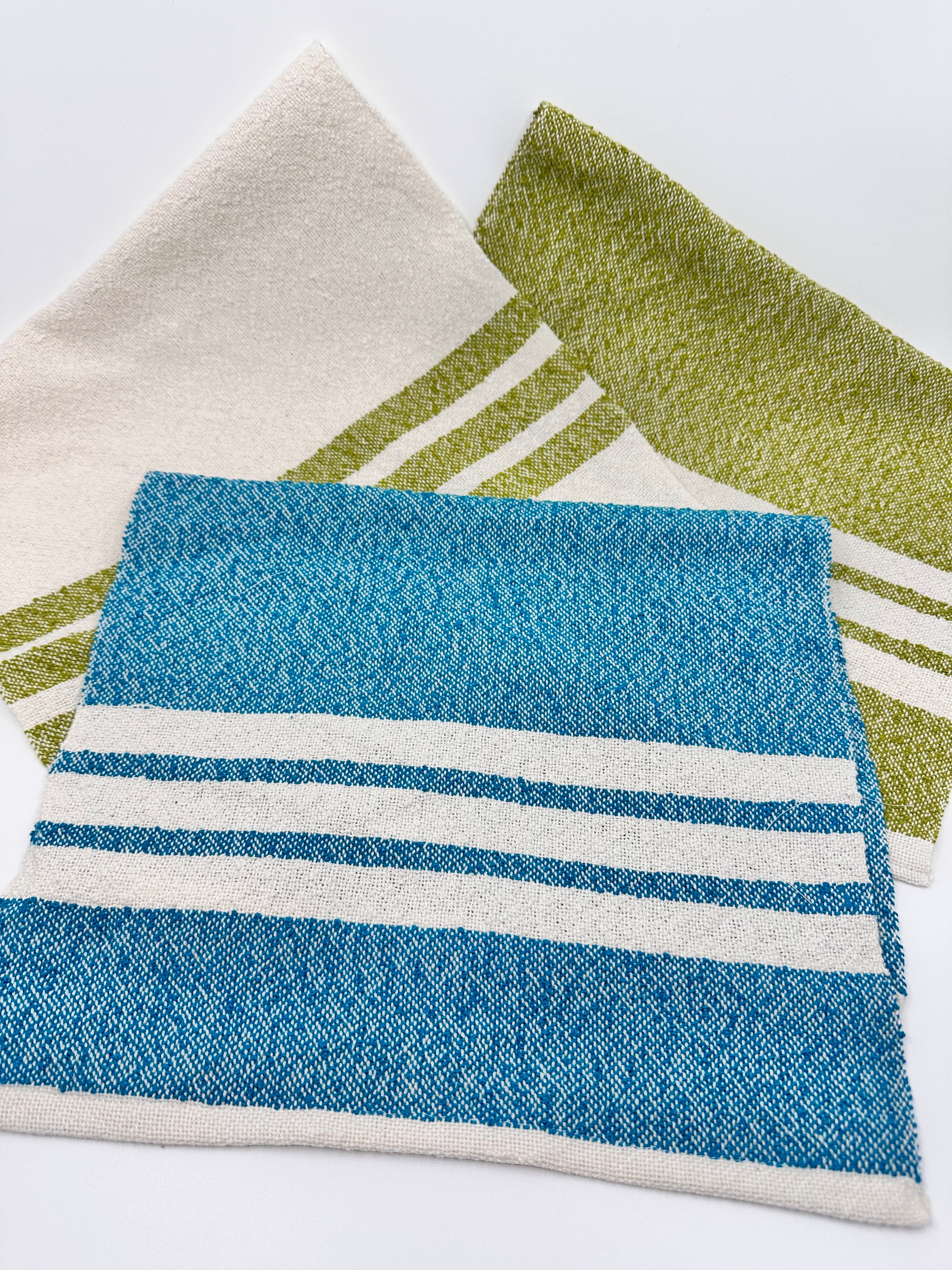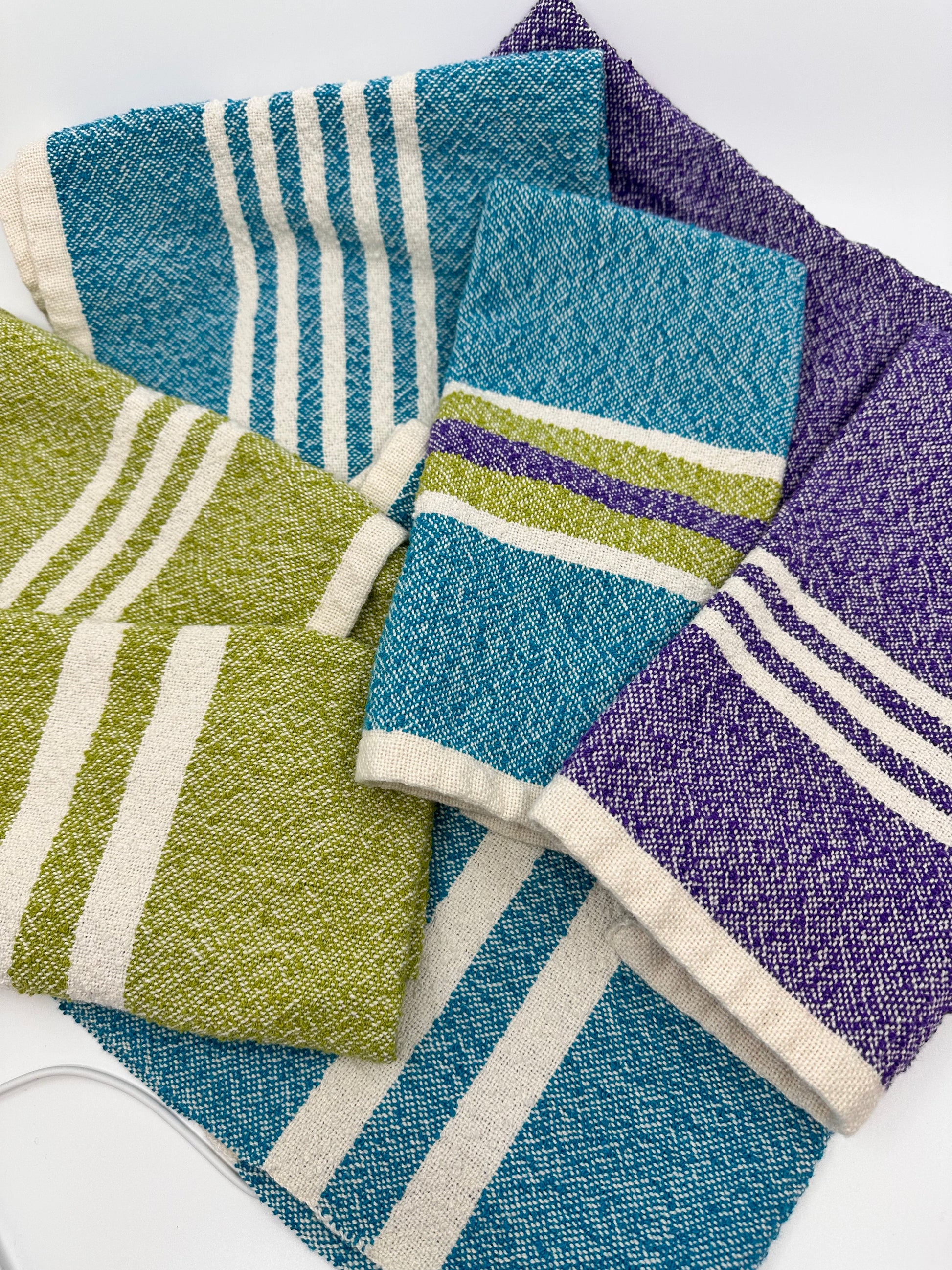 These simple plain weave towels have an 8/2 Lofty Cotton warp, sett at 15 ends per inch, and a Lofty Cotton Boucle weft.. These towels weave up quickly on your rigid heddle, table or floor loom. Try different weft colors and striping sequences for many unique towels. These are perfect for gifts.