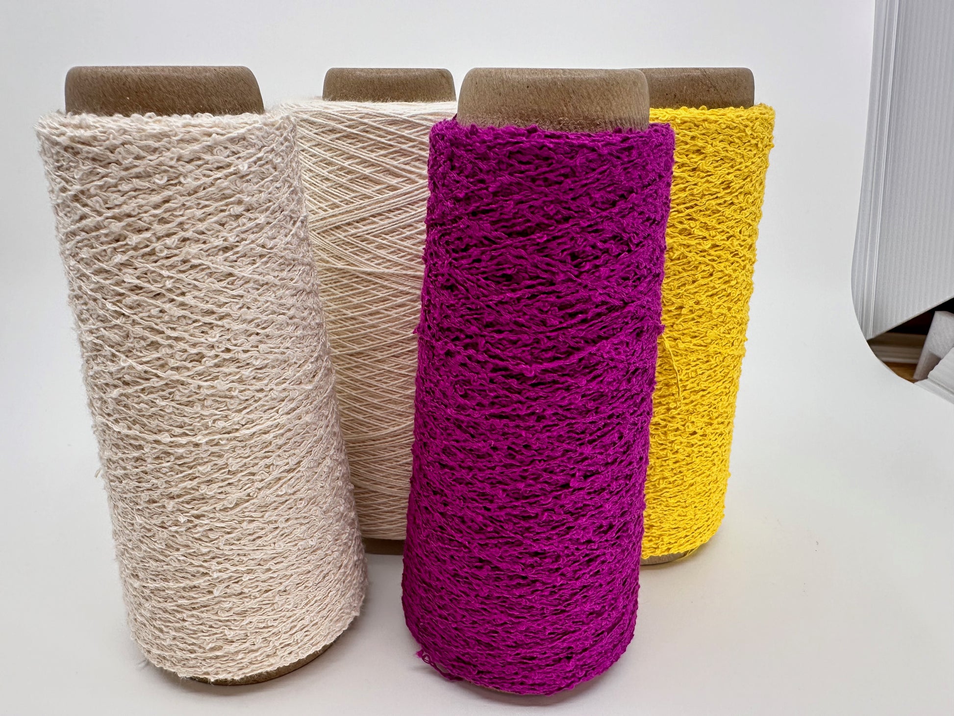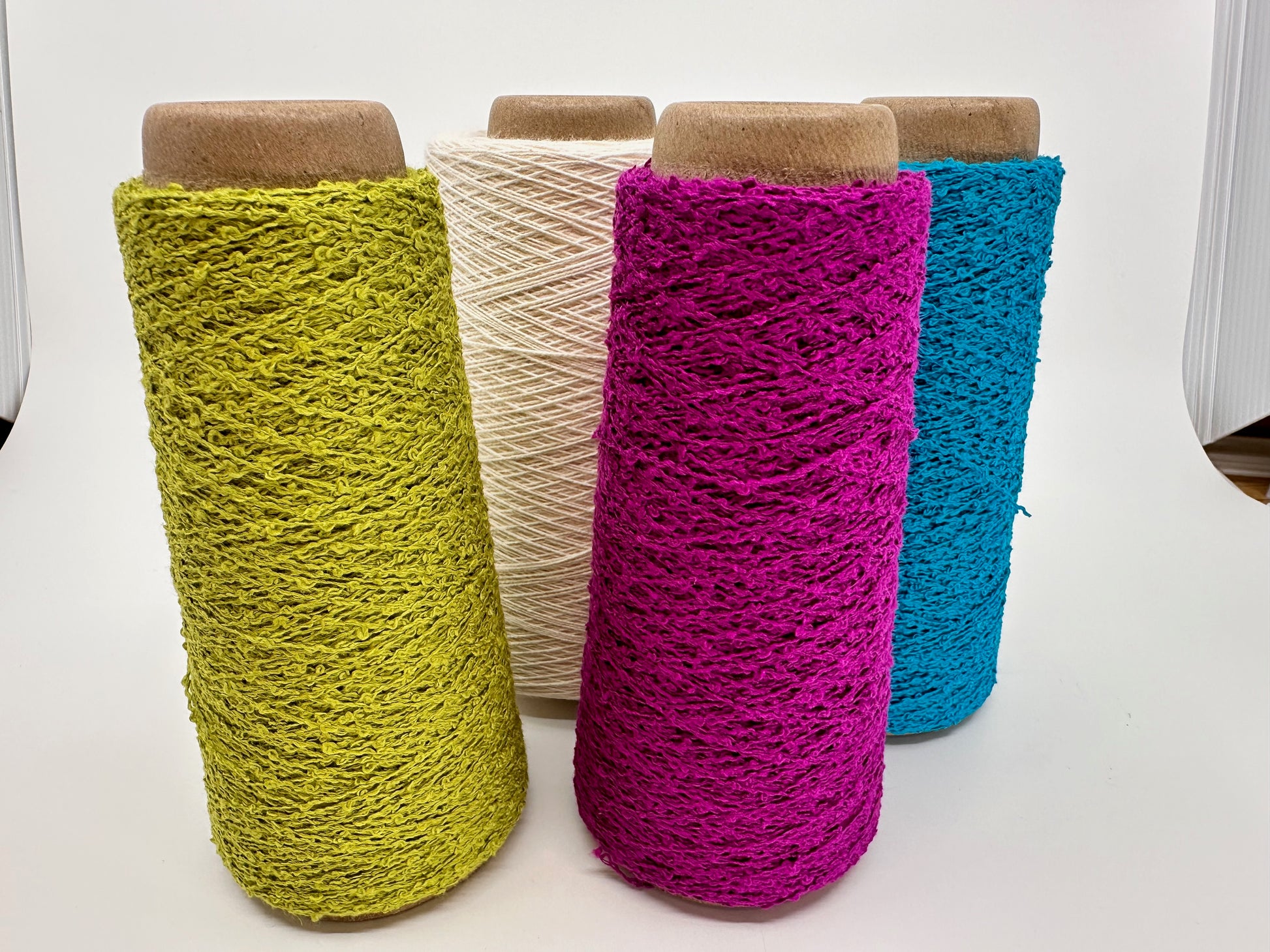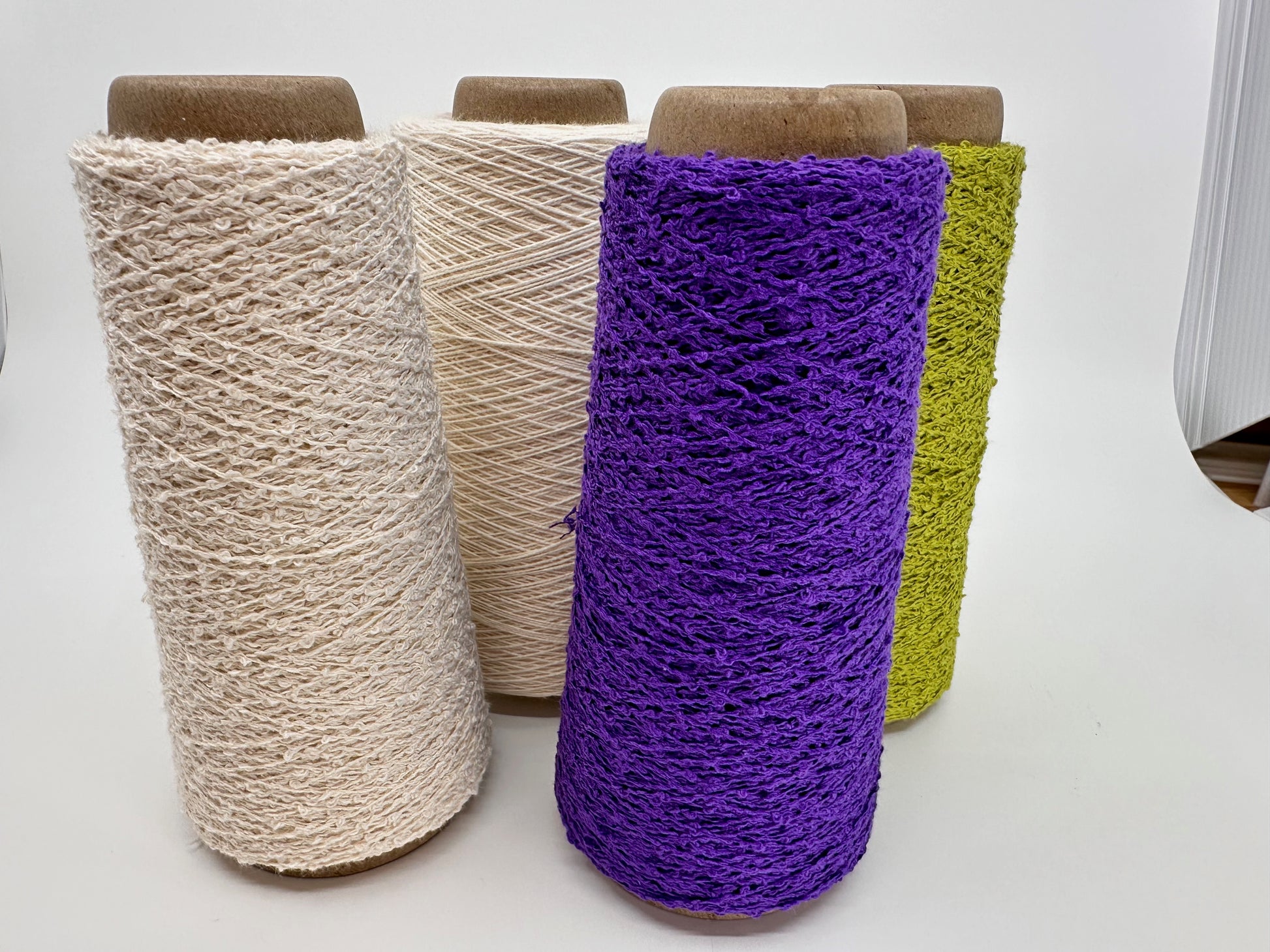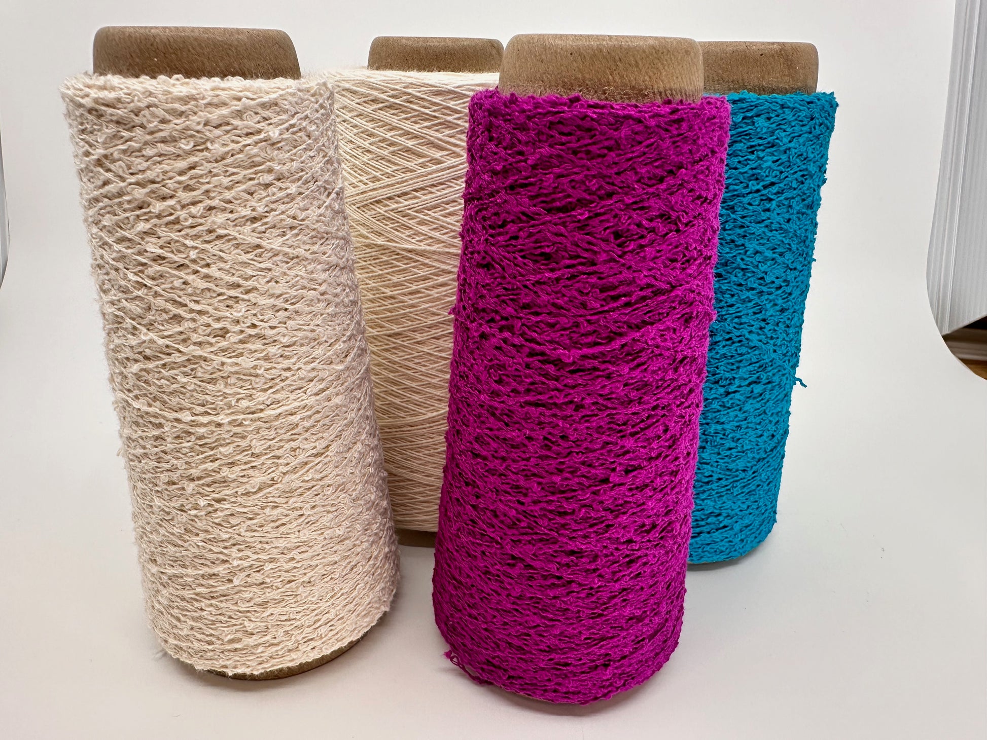 Weft: https://loftyfiber.com/collections/loftycotton-boucle Three 2-oz cones.