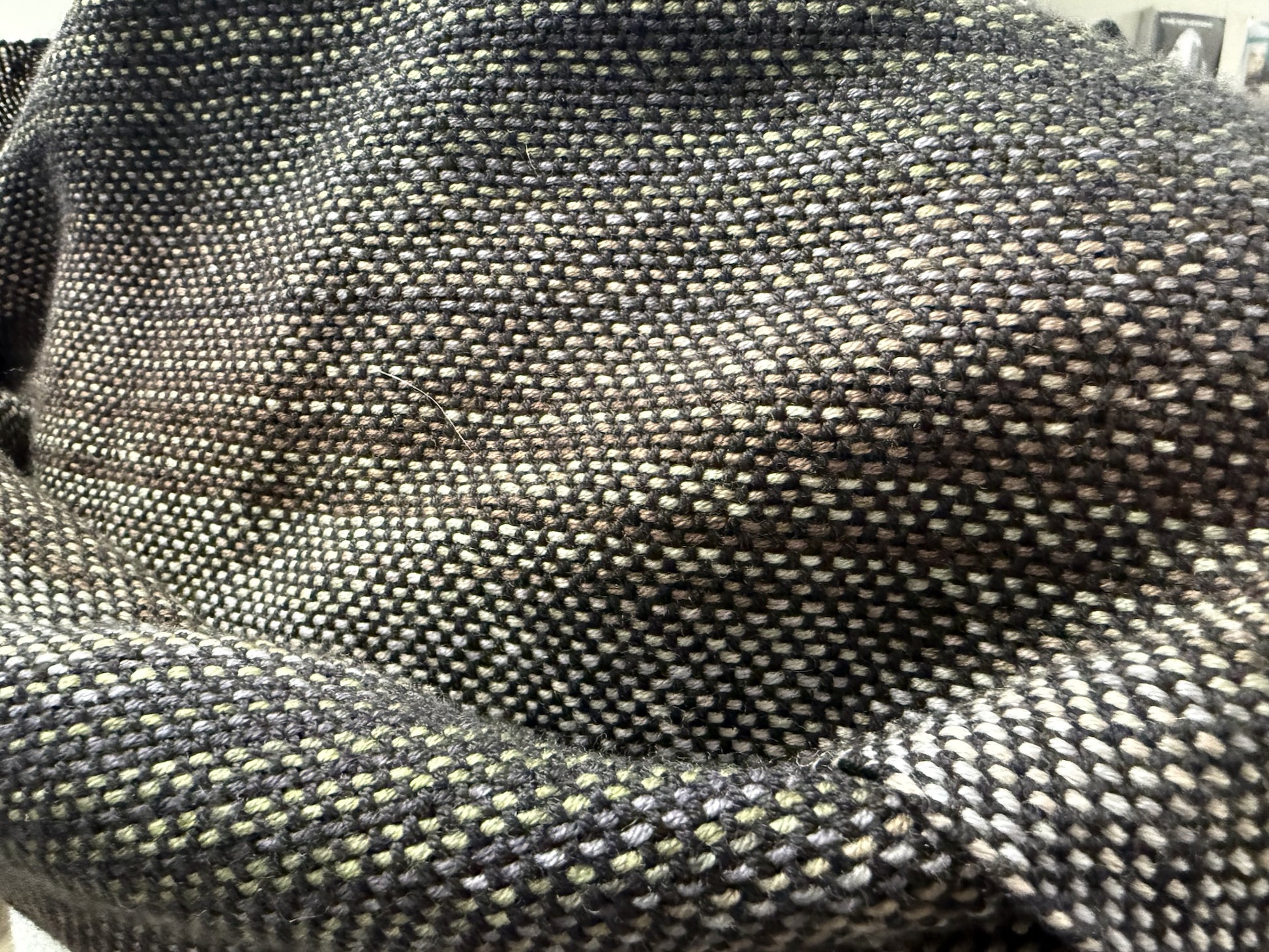 This pattern can be woven in either a 10 or 12-dent reed. The 10-dent reed results in a lighter feeling fabric that’s very drapey, and wider due to the sett. The 12-dent reed is a little thicker and warmer, and not quite as wide.