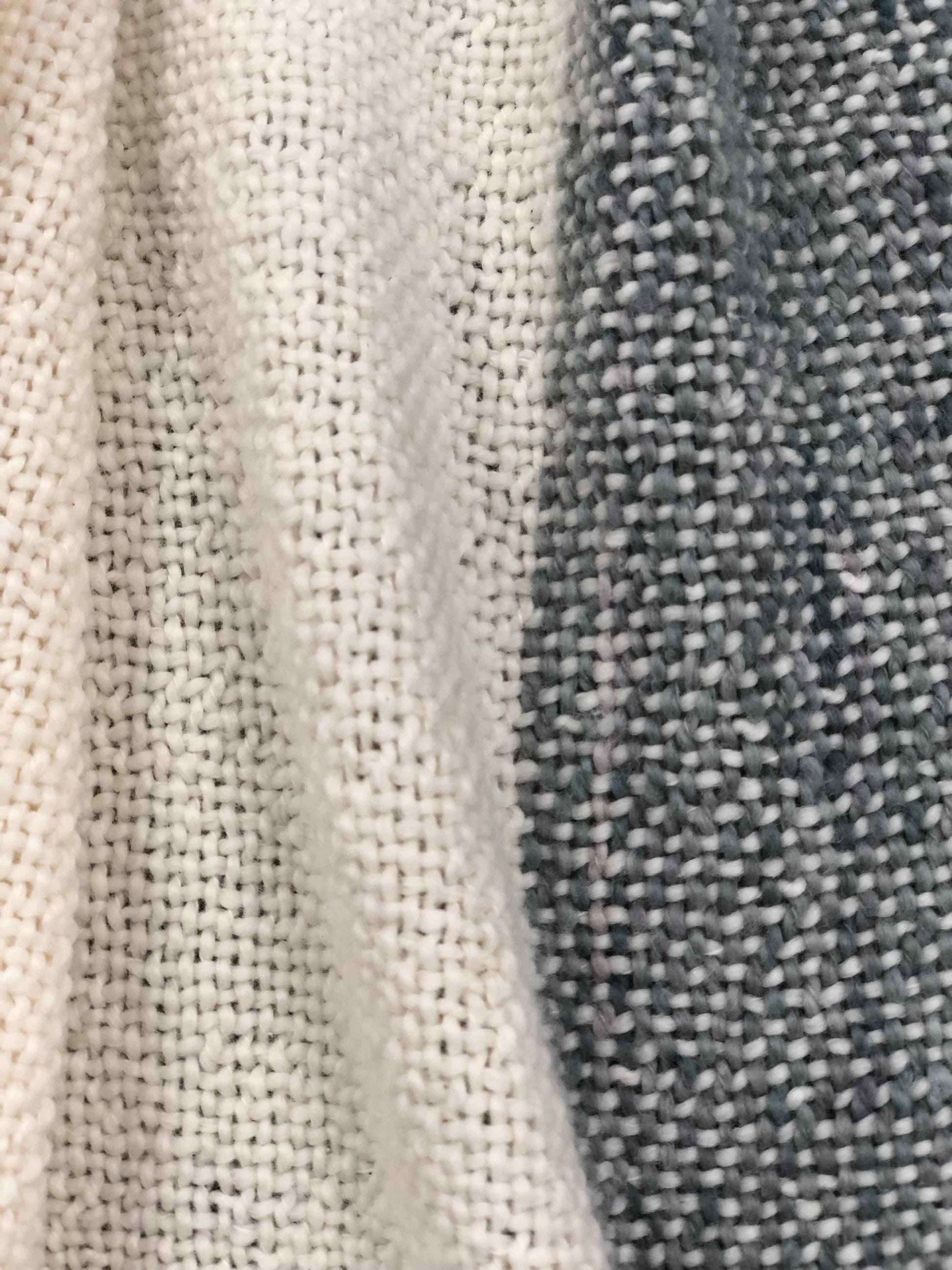 Pictured is a blanket with the gray hand-dyed cotton stripe. This yarn is gray, with subtle undertones of pink and green.