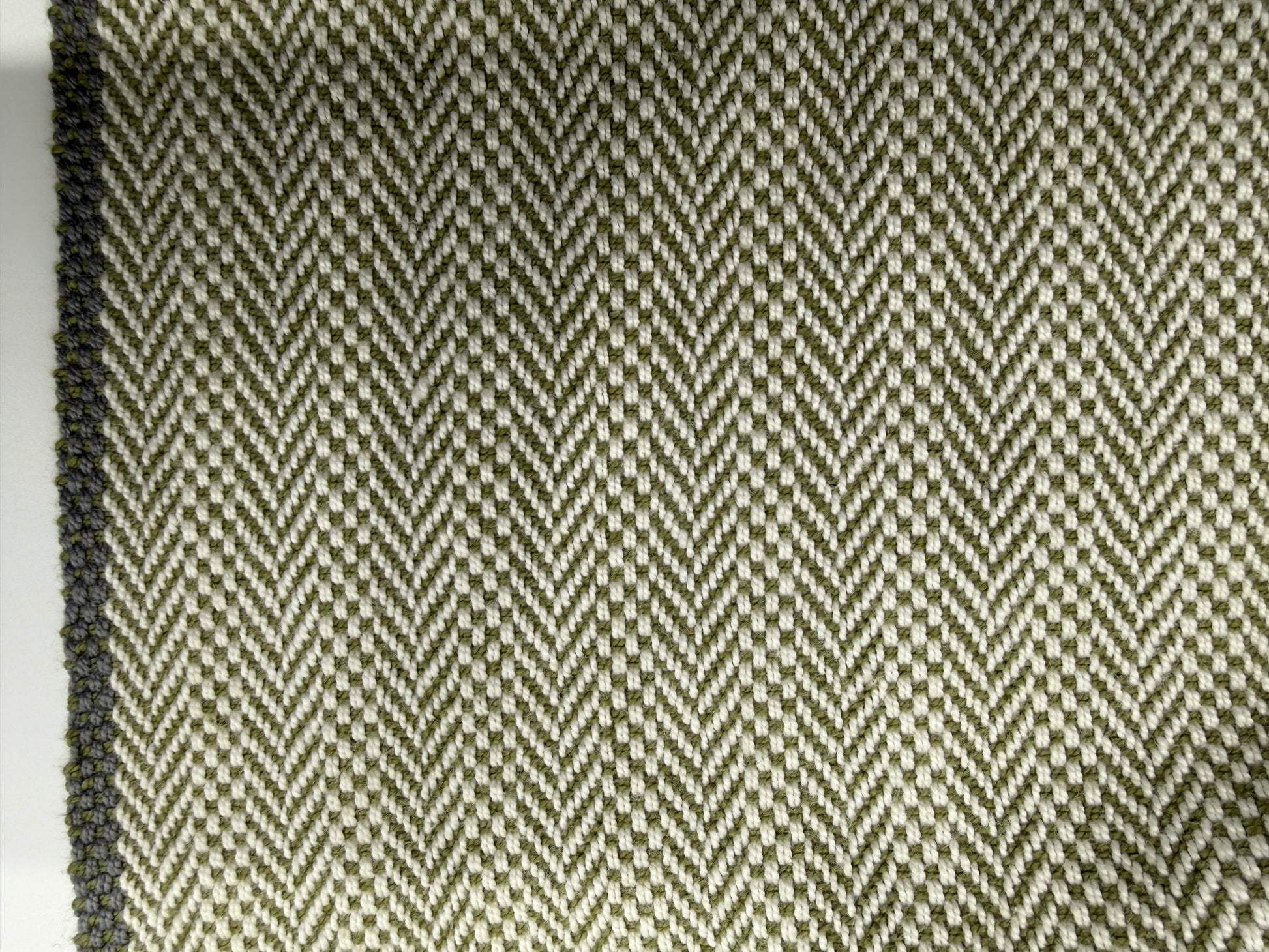 Kit Contains Lofty 8/2 Cotton - a 1-lb cone of the primary warp color (Natural), 1-oz for the side stripe color (Charcoal), and a total of 12 ounces for weft (Olive). A printed pattern is included with the yarn kit as well as a download for the PDF and WIF files.