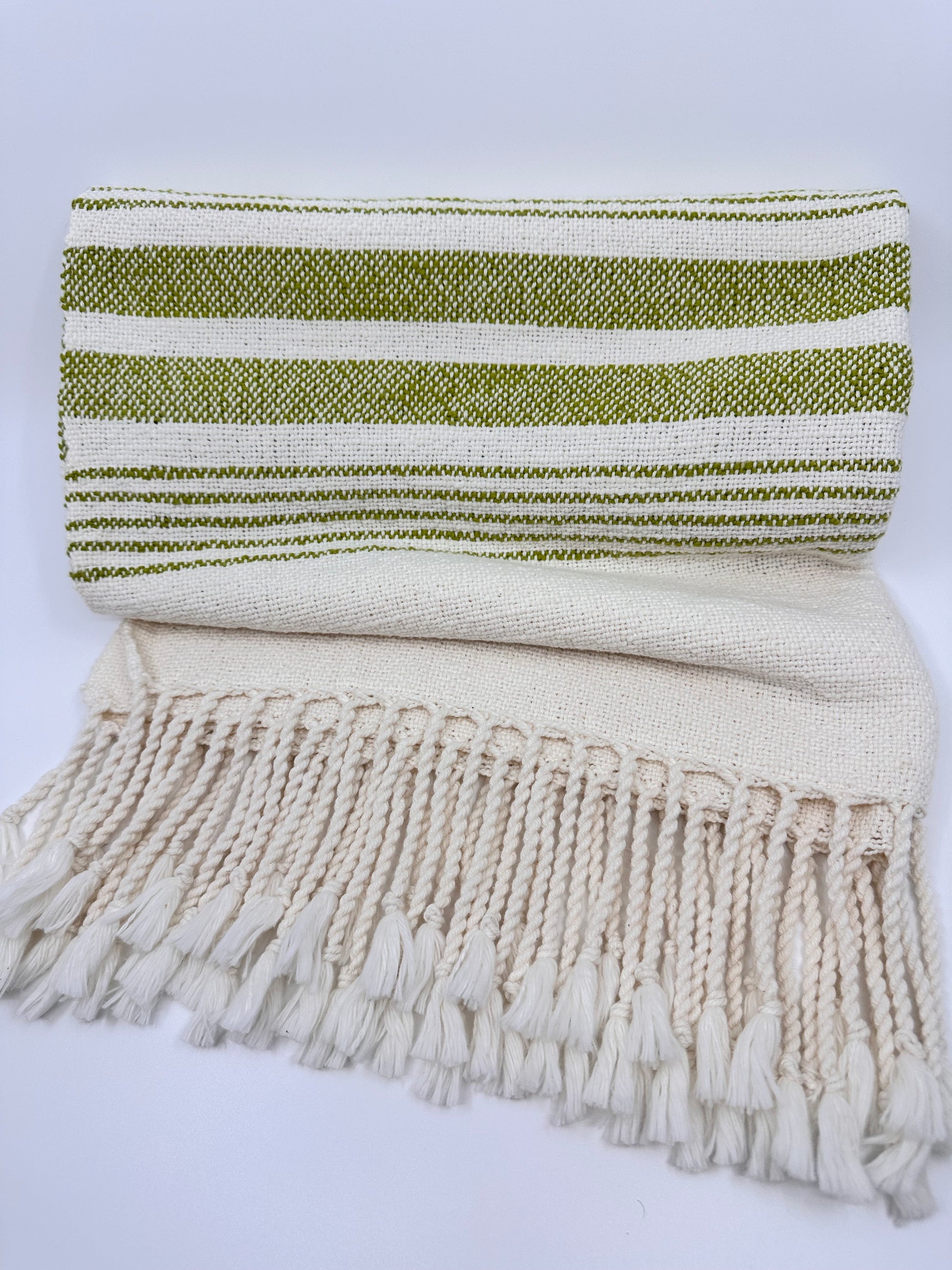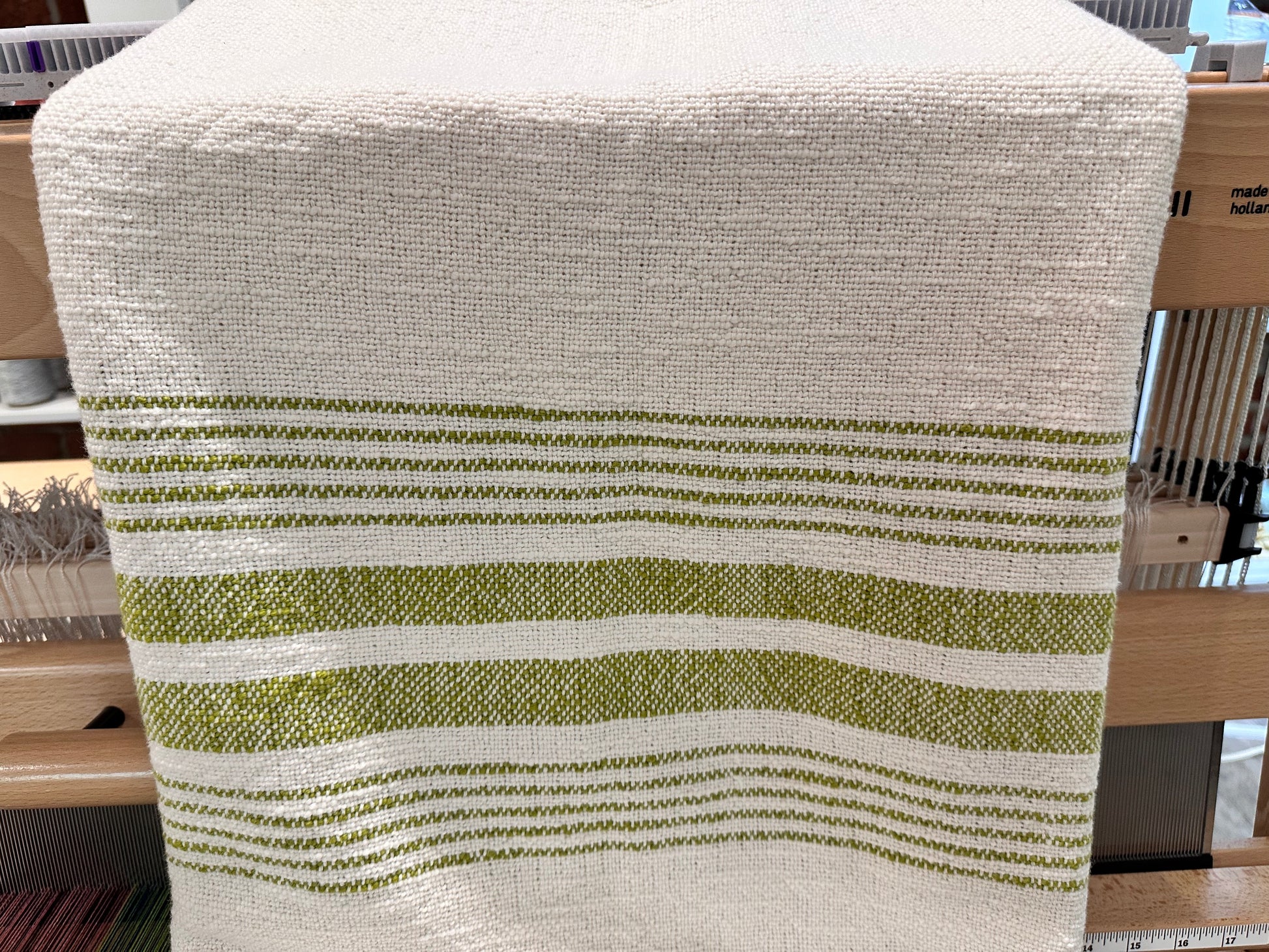 Pictured is a blanket with natural in the warp and key lime as the accent.