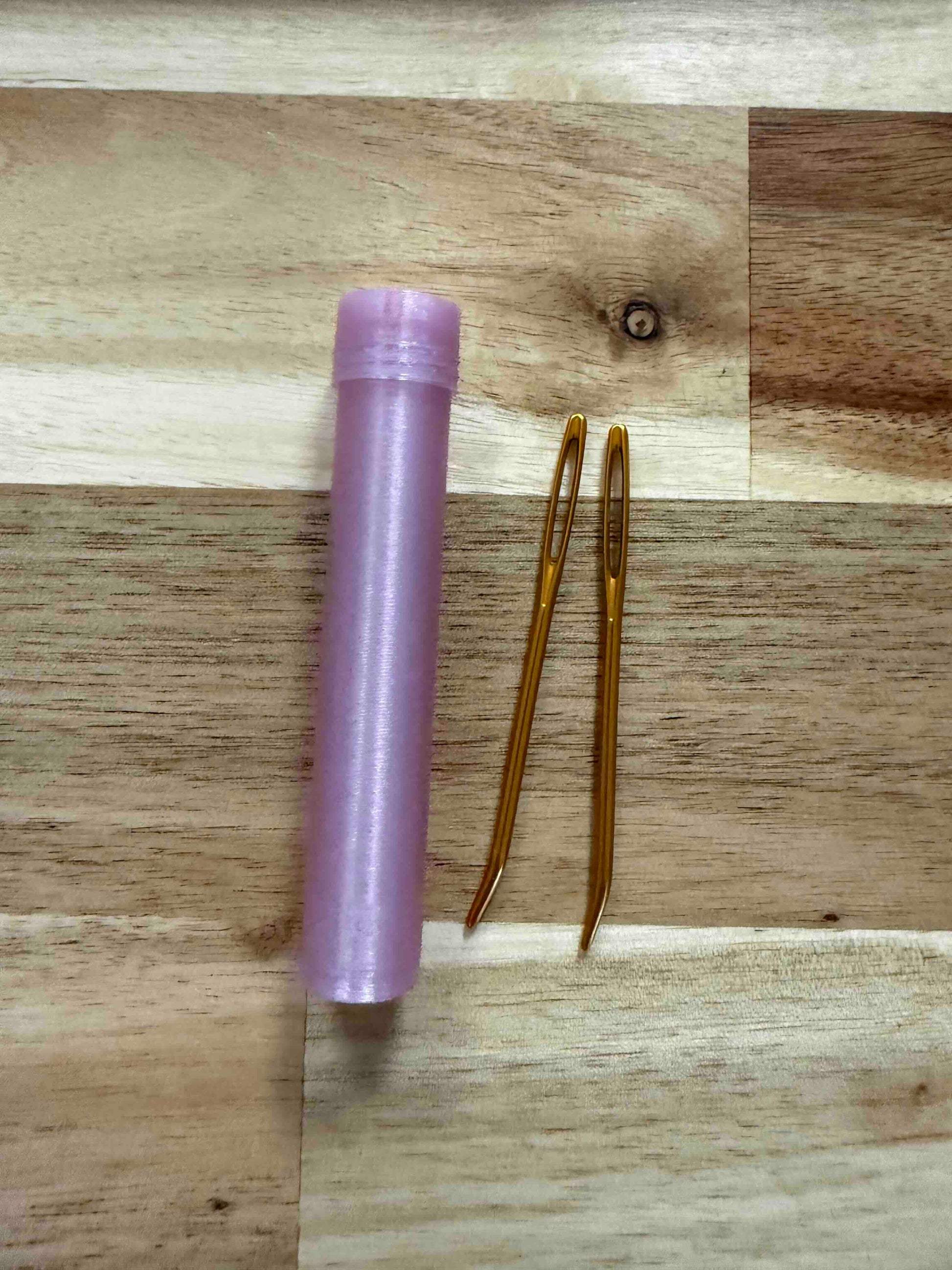 Set of 2 bent-tip needles in a 3D-printed case, ideal for sewing most knitting and crochet stitches together as well as hemstitching handwovens.