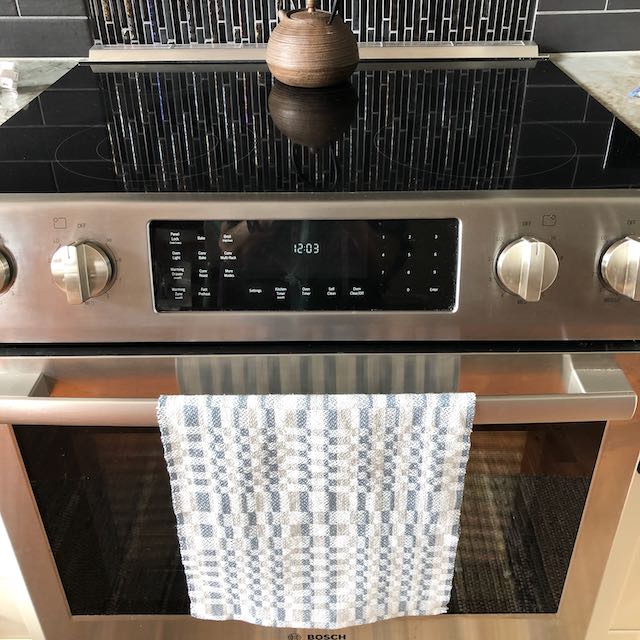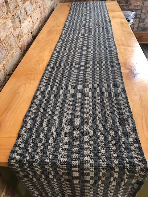 Runner is pictured with warp colors Heron Grey and Cloud Grey with a Charcoal weft. If using another color combination, translate the pattern accordingly. The towel is pictured with the same warp but a Cream weft.